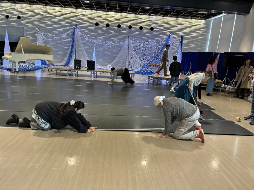 舞台設営では保護者の皆さんのお力を借りて、何も無いところから舞台を作り上げる。